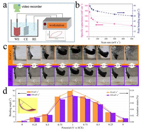 图1. (a)双层电极的电化学测试和变形观测示意图; (b)不同扫速下的比容量和最大弯曲角度对比;(c)两种扫速下的电化学驱动过程照片;(d)弯曲角度和驱动变形量的统计。