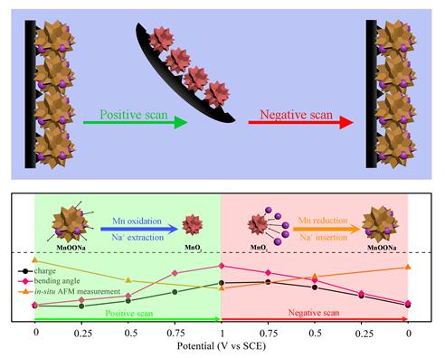 通过分析电极的电化学数据和变形过程,发现该双层薄膜的变形和MnO2的电荷储存过程有着密切的关系。使用原位原子力显微镜、原位拉曼光谱测试和第一性原理计算分析发现:在电化学扫描过程中,MnO2材料的本征氧化还原赝电容行为(Mn元素价态的可逆转换),伴随着电解液中Na+离子的嵌入脱出,导致了MnO2微米球的可逆膨胀与收缩。这种体积变化,与非活性并且没有变化的金属Ni层对抗,引起了自支撑的MnO2/Ni双层电极薄膜电极的可逆变形。这与有限元分析仿真得到的结果一致,表明了机理研究的准确性。