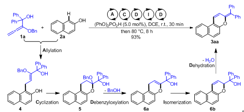 最近,中国科学院兰州化学物理研究所羰基合成与选择氧化国家重点实验室蒋高喜课题组在前期研究基础上(Angew. Chem.Int. Ed. 2017, 56, 1077-1081),通过向联烯分子中引入一个新的反应位点,利用Br?nsted酸催化联烯醚反应的特殊区域选择性,实现了该类联烯分子和简单萘酚类底物历经烷基化/环合/脱苄醇/异构化/脱水五步串联反应,高效合成了一类新颖的大p-共轭萘并吡喃化合物 (Scheme 1)。