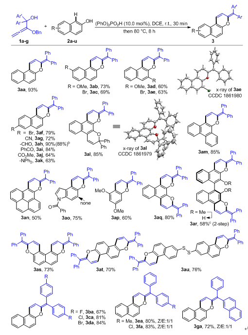 简单萘酚、二萘酚、吲哚酚和富电子苯酚以及过硫键都能在该反应非常好地兼容,实现一系列具有不同取代基的大p-共轭萘并吡喃化合物的高选择性合成,x-ray单晶分析确认了产物结构(Scheme 2)。