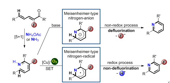 中国科学院兰州化学物理研究所羰基合成与选择氧化国家重点实验室蒋高喜课题组致力于含氮杂环化合物的合成与转化。最近,他们在前期利用氧化策略合成含氮杂环化合物的基础上(Chem. Commun.,2016,52, 9589-9592; J. Org. Chem.2017,82,765-769; J. Org. Chem.2017,82,3284-3290; Org. Lett.,2017,19,2618-2621.),以NH4OAc为氮源和2-氟-2,4-二烯-1-酮为原料,利用[5+1]环化策略,在碱或CuBr/O2催化体系下通过可控的含氮阴离子或自由基中间体高化学选择性合成吡啶和3-氟吡啶(图1)。