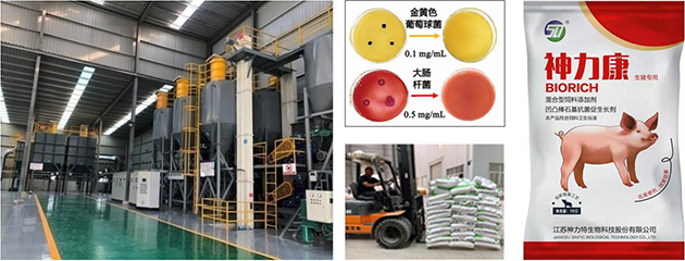 凹凸棒石是我国特色资源,具有明显区域优势,已列入饲料产品目录。该项目针对我国畜禽无抗养殖对高端替抗产品的迫切需求,依托江苏得天独厚的凹凸棒石黏土资源,利用凹凸棒石独特的孔道结构和表面性质,在凹凸棒石棒晶束高效解离的基础上,采用植物提取物为主要活性成分,通过杂化原理和“抗菌因子组装—电荷调控—表面交联”一体化工艺,创制了肠道智能释放和具有高效抗菌功能的凹凸棒石基抗菌促生长产品。动物试验结果表明,饲料中添加0.1%凹凸棒石基抗菌促生长产品就可替代抗生素(金霉素)。联合企业攻克了中试放大瓶颈和关键技术验证,建成了10000吨/年凹凸棒石替抗产品生产线,产品获得了饲料添加许可证,已在大型养殖企业得到推广应用。