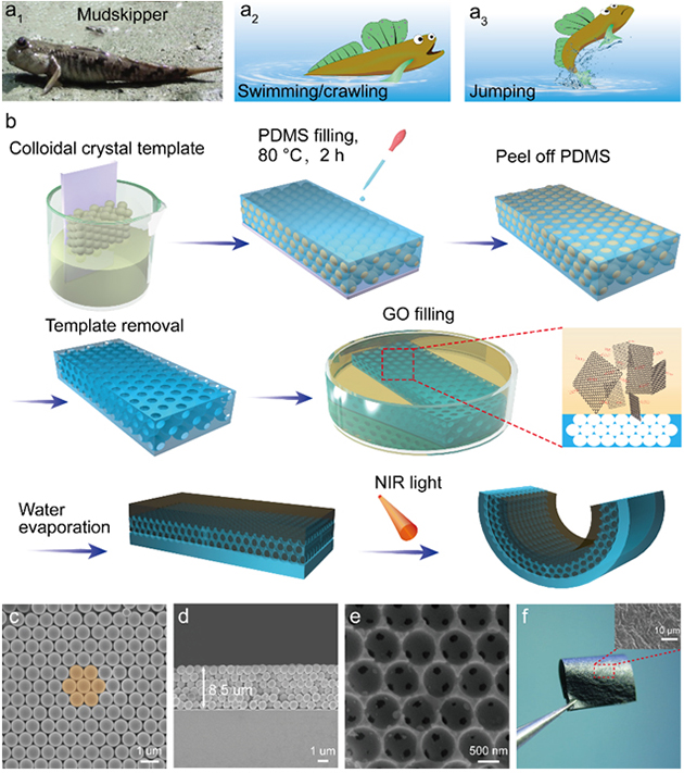 图1. 仿生弹涂鱼爬行、游动、跳跃理念及光驱动薄膜的制备和表征