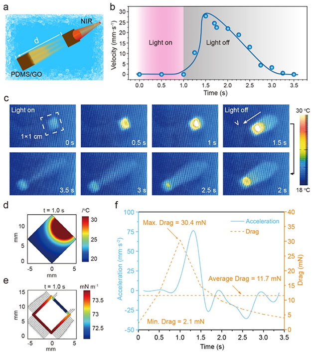 受弹涂鱼陆地爬行、液面游动和跳跃的启发,中国科学院兰州化学物理研究所固体润滑国家重点实验室周峰研究员团队开发出了一种内置多孔结构的多功能光驱动和多场景应用的仿生机器人(图1)。在光刺激下,驱动薄膜可以迅速在水面游动,这是由于受光热效应的影响薄膜周围液体表面张力变小,形成梯度张力,驱使薄膜向高表面张力区域移动,即马兰戈尼效应(图2a-c)。研究人员使用ANSYS软件建立有限元模型模拟并计算了薄膜的温度和应力场,证实了这一现象的合理性(图2d, f)。
