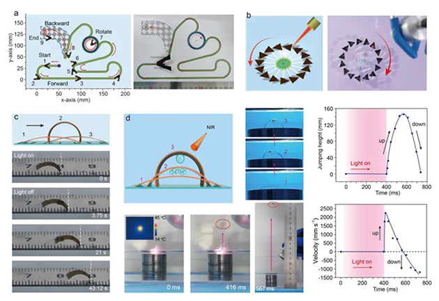 通过合理的设计和对光的有效控制,驱动薄膜可以在水面上沿预先设计的路线完成直线、转弯、旋转和后退等运动(图3a),也可以在固定光源照射下像游轮螺旋桨一样自行旋转运动(图3b),驱动薄膜还可以克服乙醇溶液的阻力,完成液下爬行(图3c)。在光刺激下,驱动器可以在极短的响应时间(400ms)内从液体介质跳跃到空气中,最高速度为2m/s,高度可达14.3cm(图3d)。