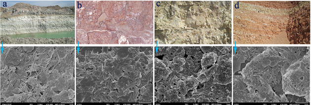 图1 江苏凹凸棒石黏土矿(a)和甘肃砖红色(b)、土黄色(c)和杂色(d)混维凹凸棒石黏土矿数码照片及其相应SEM照片