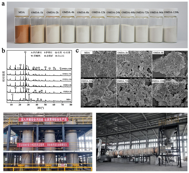 图2 混维凹凸棒石黏土及其草酸梯度溶蚀样品的数码照片(a)、XRD图谱(b)和SEM图(c)及其1万吨/年生产线