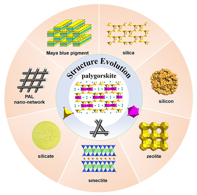 鉴于团队在凹凸棒石黏土结构演化及其功能材料构筑方面取得的系列工作进展,受邀以“From structure evolution of palygorskite to functional material: A review”为题发表了综述性文章(Micropor. Mesopor. Mater., 2022, 333, 111765),全面总结了研究者在凹凸棒石黏土结构演化构筑各种功能材料的研究进展,强调了混维凹凸棒石黏土全矿物利用的重要性,以期为混维凹凸棒石黏土功能材料应用提供有益参考。