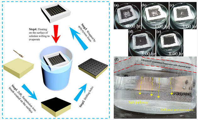 基于上述实验结果,研究人员又选用ZrB2作为吸光材料,将其与3-氨基丙基三乙氧基硅烷(APTES)混合刷涂于硅酸铝陶瓷纤维板表面,制备出具有优异光吸收能力(α=95%)的耐盐污界面蒸发装置(图2),该装置的水蒸发率高达2.07 kg·m-2·h-1。研究过程中发现硅酸铝陶瓷纤维板内部的微观结构可与水结合生成过渡水,水状态的改变极大地降低了水蒸发所需的能量,从而获得了超出理论极限值的蒸发效率。此外,孔阵列排布可改善装置的耐盐污能力,使其能够长期、高效、稳定应用于海水蒸发(Chemical Engineering Journal, 2022, 431, 134333)。