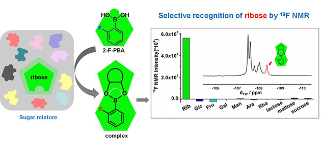 近日,该团队通过基于19F NMR的探针分子2-氟苯硼酸(2-F-PBA)研究了尿液中核糖的快速和高选择性识别(图1)。研究发现,当2-F-PBA与核糖结合时,在19F NMR谱中快速生成特征信号,该信号可用作识别核糖的指纹。2-F-PBA是一种适于在生理条件下测定核糖的19F NMR探针分子,具有高选择性和较强的抗干扰能力。当2-F-PBA用于测定人尿液中的核糖时,不需要样品预处理。在确定的19F NMR检测条件下如400 MHz、512次扫描、约12分钟的检测限达到78 μM,可满足实际应用的需要。因此,基于19F NMR的探针分子2-F-PBA具有无创诊断白质脑病的潜力。