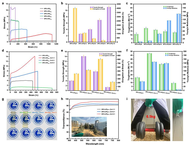 图 1 (a)不同R值SPU-UPy-R应力-应变曲线。(b) SPU-UPy-R拉伸强度和断裂伸长率直方图。(c) SPU-UPy-R韧性和杨氏模量直方图。(d) SPU-UPy0.5-Zn-x应力-应变曲线。(e) SPU-UPy0.5-Zn-x拉伸强度和断裂伸长率直方图。(f) SPU-UPy0.5-Zn-x韧性和杨氏模量直方图。(g)透明薄膜样品照片。(h)样品SPU-UPy0.5 , SPU-UPy0.5: Zn=1:1,SPU-UPy0.5: Zn=2:1,SPU-UPy0.5: Zn=3:1透射光谱图。(i)样品SPU-UPy1.0承重示意图。