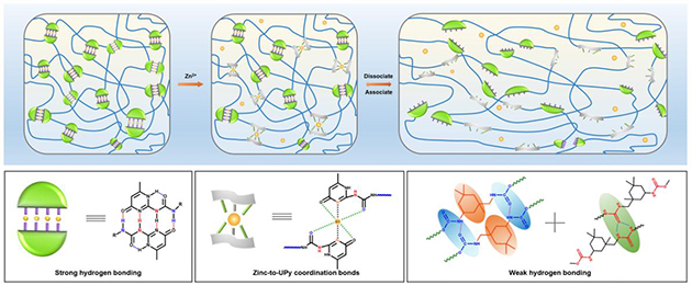 该课题组通过将含有四重氢键的2-脲基-4-嘧啶酮(UPy)基序引入到聚合物骨架中,随后与锌离子进行配位,成功合成了一系列新型超分子聚氨酯。依靠优化的分级氢键和金属-配体配位键的协同增强作用,获得的超分子聚氨酯弹性体表现出优异的拉伸强度(~14.15 MPa)、出色的韧性(47.57 MJ m-3)以及超高的杨氏模量(~146.92 MPa)(图1)。