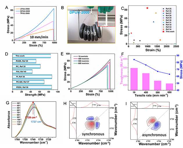 图3(A)LPUU-2000、DPUU-2000和TPUU-2000的应力-应变曲线。(B)DPUU-2000提拉10公斤重物示意图。(C)DPUU-2000的力学性能与之前报道的工作的比较。(D)DPUU-2000与工程塑料抗拉强度的比较。(E)不同拉伸速率下DPUU-2000应力-应变曲线。(F)DPUU-2000在不同拉伸速率下强度和韧性的变化趋势。(G)DPUU-2000的原位FTIR光谱。(H)DPUU-2000的同步和(I)异步2D-COS谱。