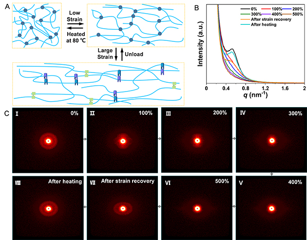研究人员利用二维红外分析测试证明了多重氢键的存在,小角散射结果证明了微相分离结构的形成。其中,DPUU-2000材料具有最佳拉伸性能,拉伸强度可达84.2 MPa、断裂伸长率为925.6%、韧性为322.8 MJ m-3(图3)。另外,通过原位拉伸小角散射证实,材料在拉伸过程中由于氢键的解离破坏了材料中的微相分离结构,在材料加热恢复后,氢键的重组使得材料的微相分离结构重新形成(图4)。借助于硬链段作为固定相与软链段作为可逆相,该材料具有形状记忆的特性,可在-40℃时暂时固定形状,在30℃时恢复原始形状。