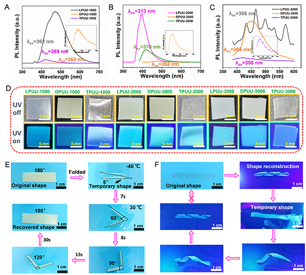 图5 (A) LPUU-1000、DPUU-1000和TPUU-1000的PL光谱。(B) LPUU-2000、DPUU-2000和TPUU-2000。 (C) LPUU-3000、DPUU-3000和TPUU-3000的PL光谱。(D) PUU在365 nm紫外灯开启和关闭条件下的示意图。(E) DPUU-2000形状固定和恢复过程的照片。(F) TPUU-2000在365 nm紫外光照射下的形状重构后的形状记忆过程示意图。