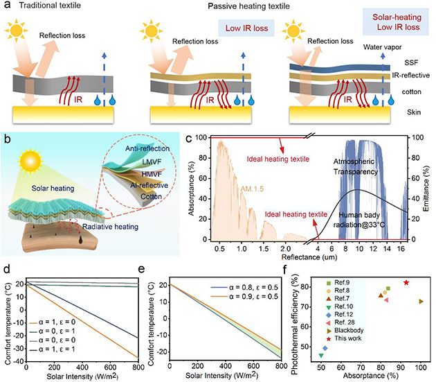 据此,研究人员通过理论计算结合实验验证的方法对多层薄膜光学性能进行优化(如图2所示)。优化后的选择性吸收涂层在金属铝修饰的棉布上实现了92.8%的高吸收率和39.2%的低发射率,具有优异的光热转化效率(82.2 %,600 W m-2,0 °C),相比于已报道的太阳能加热织物具有明显优势。随后,研究人员对织物的加热能力进行实验验证。由于织物较低的发射率,使得室内空调的设定温度降低3.5 °C,从而减少了能源消耗。
