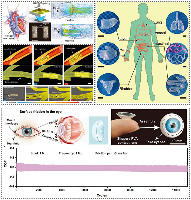 利用水凝胶优异的水润滑性能和3D打印技术的个性化制造优势,该团队近期发展了水凝胶动脉三尖瓣膜、用于狭窄病变组织器官的水凝胶支架(Chemistry of Materials,2022,34,6129-6141)、湿滑水凝胶仿生软组织器官模型(Advanced Functional Materials, 2022,32,2108845)和润滑载药功能一体化水凝胶隐形眼镜(Small,2023,2206819)等多种功能性的水凝胶器件,为湿滑水凝胶在仿真器官模型、生物医疗器械等应用提供了材料技术(图3)。相关材料与技术已获2件中国发明专利授权(ZL 202110635655.6;ZL 202110635657.5)。