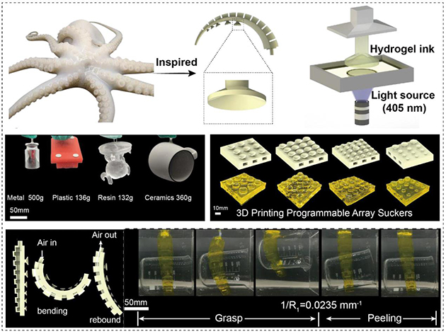 图4. 3D打印的水凝胶仿生粘附吸盘及智能抓取器