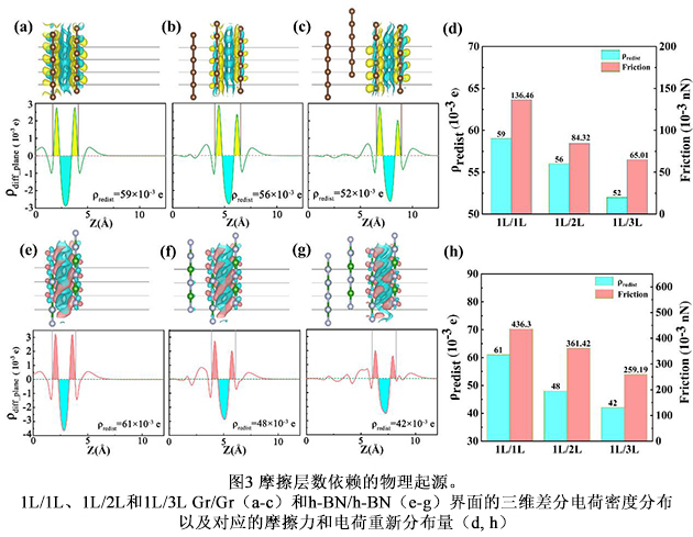 摩擦随着层数的增加而减小是2D材料摩擦性能的一个重要特征。该研究中,DFT计算结果再现了摩擦层数依赖的实验现象,首次在原子尺度上提出了关键见解——除了褶皱效应、电子-声子耦合和摩擦接触质量之外,原子位置的面内调整是摩擦层数依赖背后的另一个关键因素(图2)。研究发现,原子位置的面内调整将减少电荷的重新分布,进一步减少层间的摩擦,这应该是其导致摩擦随着层数的增加而减小的物理起源(图3)。此外,该结果可很好地解释基底吸附强度对摩擦层数依赖的影响。