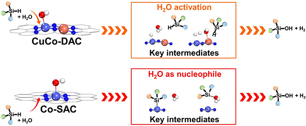 图1. CuCo-DAC和Co-SAC上硅烷氧化反应中水活化的机理差异