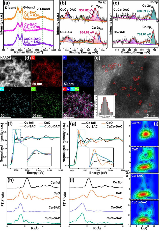 一系列催化剂结构表征确定了Cu-Co双原子催化剂中存在金属-N配位和Cu-Co配位。同时,研究人员进一步验证了双原子是以CuCoN6(OH)为基本结构单元锚定在氮掺杂碳材料上,其中羟基官能团与原子Co键合(图2)。
