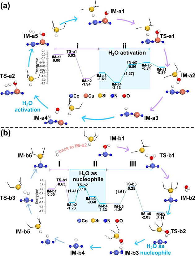 图3. (a) CuCo-DAC和 (b) Co-SAC上硅烷氧化的反应路径和反应能垒