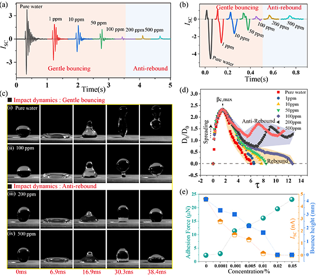 研究人员通过在水中添加微量的聚氧化乙烯,配制不同浓度的聚合物溶液,建立起聚合物液滴弹跳动力学与其产生的电信号之间的关联(图2),利用电信号追踪不同浓度聚合物液滴的弹跳细节,实现了农药雾滴在叶片表面的粘附、润湿、弹跳等行为的电信号数字化表达,为智慧农业监测提供了新思路。