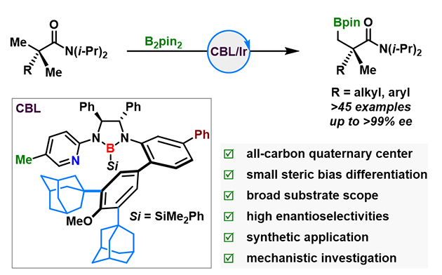 近日,该团队针对不对称碳-氢键活化在构建手性季碳中心的挑战性难题,利用手性CBL的多位点协同调控策略,高对映选择性地实现了偕二甲基类化合物的去对称化碳-氢键硼化反应。