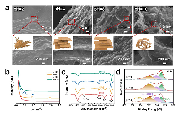 图2. 不同pH下MXene凝胶拓扑结构及表面端基成分的区别