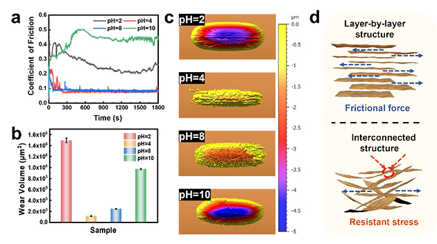 研究人员采用MXene凝胶作为润滑剂,通过对体系中pH的控制,实现了其润滑性能的突变。摩擦测试表明,pH4凝胶的摩擦系数可降至0.1以下,较pH10降低了约0.35,同时,磨损体积也有大幅降低,表现出优异的减摩抗磨性能,这种现象主要归因于不同pH下凝胶拓扑结构的差异。