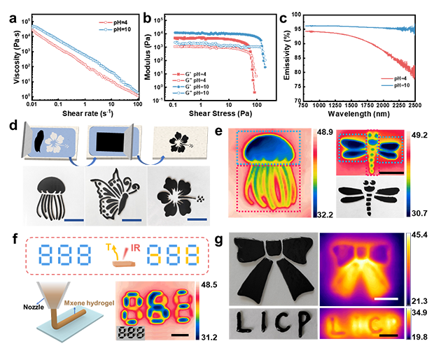 基于MXene凝胶适宜的流变学行为,将其作为墨水用于涂布和挤出打印。研究发现凝胶的红外发射率和红外光热转化效率受其表面基团及内部结构的影响,故不同pH下的凝胶表现出非一致的热屏蔽和光热转化能力。基于此,凝胶在信息加密和红外防伪等领域表现出出色的潜在应用价值。