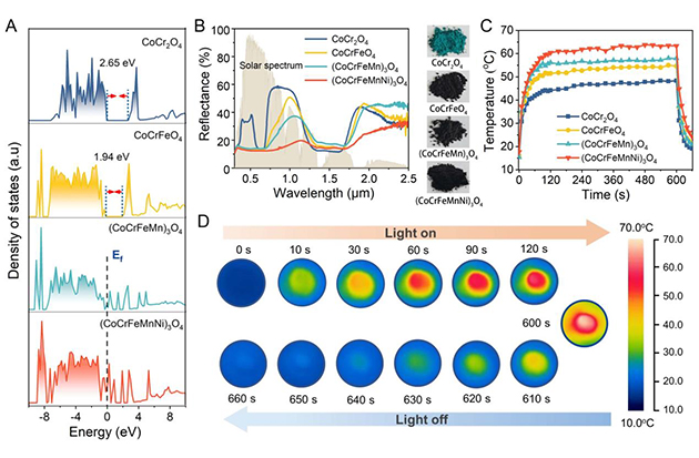 基于前期高熵尖晶石氧化物红外辐射性能的研究基础,近日,研究人员开展了高熵尖晶石氧化物光吸收机制研究。为实现太阳光全波段光吸收特性,研究人员通过选用电子分布互补的过渡金属元素对材料的能带结构进行理论设计,采用溶胶-凝胶燃烧法成功制备出一种具有面心立方结构(FCC)单相结构的高熵尖晶石氧化物。与二元尖晶石氧化物相比,高熵氧化物由于独特的高熵效应、晶格畸变效应和鸡尾酒效应,使得轨道能级发生分裂、费米能级附近电子密度增加以及金属与氧强杂化作用,将尖晶石氧化物的带隙从2.65 eV大幅度降至0 eV,实现了准金属特性,促进了电子从价带向导带跃迁,从而实现全波段太阳光吸收特性。