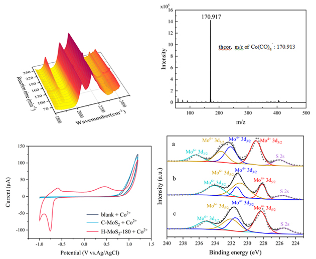 图3. H-MoS2促进醋酸钴生成的四羰基钴负离子的原位红外光谱(左上);电喷雾质谱图(右上);电化学循环伏安图(左下);H-MoS2的X-射线光电子能谱(右下)