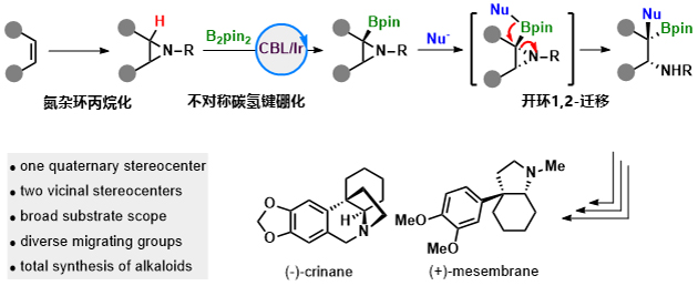 近日,该团队针对简单烯烃不对称多官能团化存在的问题,利用其发展的CBL/铱催化体系,结合烯烃的氮杂环丙烷化/开环1,2-迁移硼化的组合策略,实现了简单烯烃的不对称三官能团化反应,高对映选择性地实现了邻位季碳中心的手性胺。同时,利用该方法,团队首次实现了从廉价易得的环己烯到石蒜科生物碱(-)-crinane和(+)-mesembrane的对映选择性全合成。
