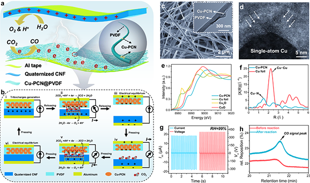 近日,研究团队与新加坡科学技术研究局的科研人员合作,在界面电荷利用方面做出新突破,利用单原子铜锚定的聚合物碳氮化物催化剂和季铵化纤维素纳米纤维成功实现了接触电催化CO2还原,生成CO的法拉第效率达到96.24 %。季铵化纤维素纳米纤维由于含丰富的羟基,可在高湿度环境中与水分子形成氢键,固定水分子并参与接触带电并发生氧化反应,导致氧气和质子的产生,参与触电催化CO2还原过程。这种方法在低浓度CO2环境中能高效地将其转化为CO,为减少大气CO2排放和推进化学可持续性策略提供了一种解决方案。