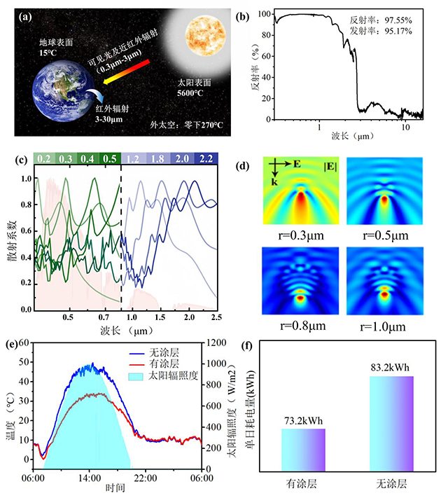 图2. (a) 构建地球-太阳-外太空能源利用体系;(b) 辐射制冷涂层反射光谱;(c) 不同粒径光学材料对0.5μm入射光的散射系数和(d) 电场分布;(e) 2024年8月18日06:00-19日06:00,太阳辐照度及储能集装箱表面温度变化和(f) 空调制冷耗电量变化