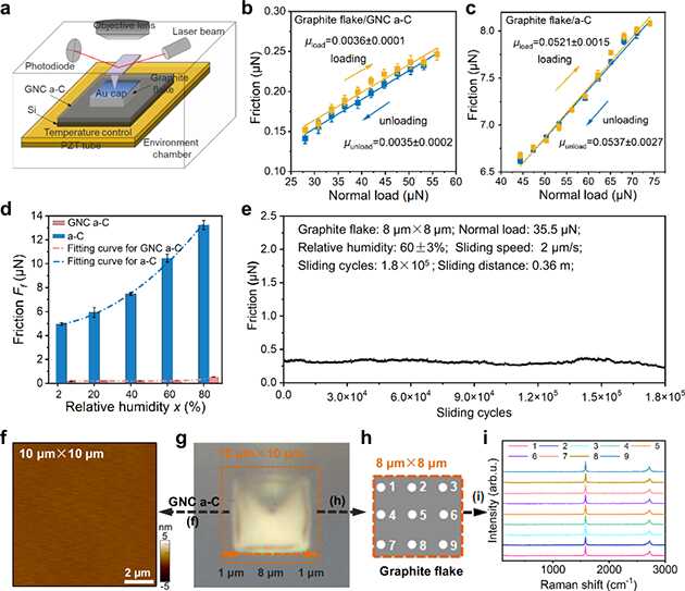 近日,研究人员针对固体表面湿度敏感、超润滑跨尺度易失效等基础科学问题开展系统研究。基于文献调研,发现固体表面湿度敏感源于磨损后暴露的新表面,导致与水分子作用强烈的化学断键形成。研究人员提出了运动界面“(近似)无磨损无化学反应”思路,通过磁控溅射物理气相沉积技术,制备石墨烯覆盖表面的纳米结构碳薄膜,构建碳薄膜/微观石墨岛体系,实现了稳健、湿度不敏感超润滑(即相对湿度2-80%下均实现超滑)。鉴于界面近似无磨损特性,该体系表现出结构性超润滑性质。