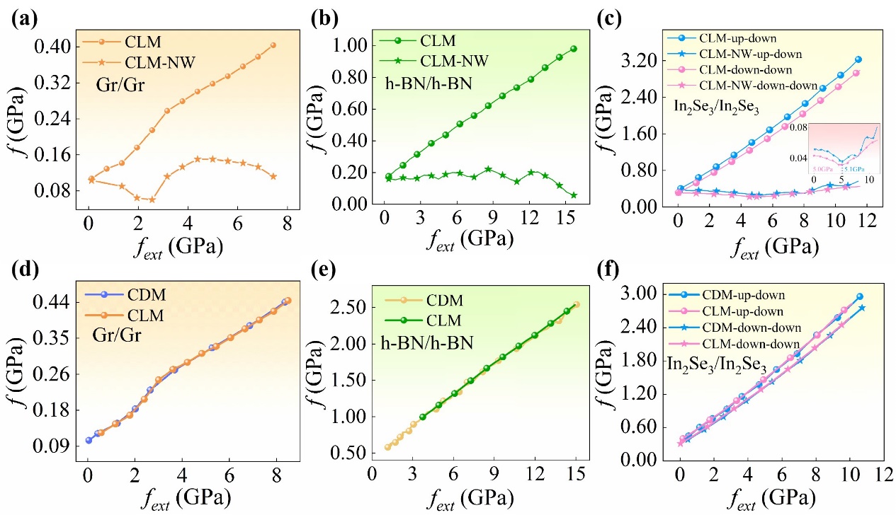 近日,中国科学院兰州化学物理研究所润滑材料全国重点实验室计算摩擦学课题组与兰州交通大学材料科学与工程学院等单位合作,使用自主搭建的固体界面摩擦性能第一性原理高通量计算平台LICP-FPHTC-Platform ( 摩擦学学报42(2022)493;软件著作权2021SR1172689),考虑目前主流的三种静态摩擦性能计算模型——等距模型(CDM)、等载模型(CLM)、无负载做功的等载模型(CLM-NW),针对已报道了负摩擦系数的二维材料界面体系——Gr/Gr、h-BN/h-BN、In2Se3/In2Se3,研究了摩擦性能的计算结果对计算模型的依赖。结果表明,只有CLM-NW的计算模型出现了文献报道的负摩擦系数现象,CDM和CLM的摩擦计算结果定量一致(图1)。
