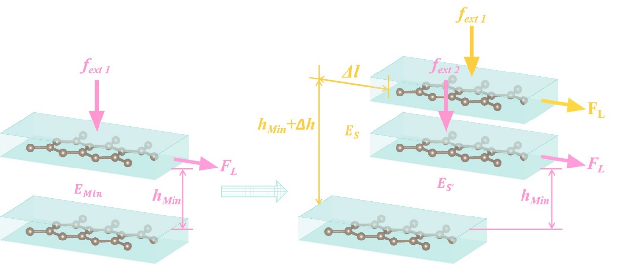 图2 等载和等距滑动过程中界面受力示意图。滑动过程中的能量最小点(左)和鞍点(右)。黄色和粉色标记分别表示等载和等距滑动过程的界面信息