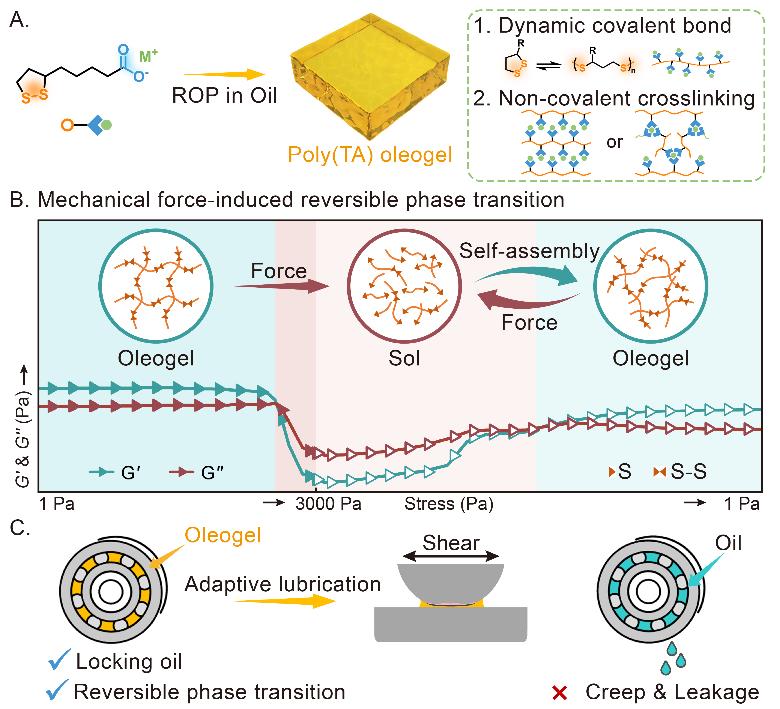 针对传统润滑油脂在新型高端装备应用中面临爬移、泄漏、粘滞阻力高等难以应对复杂多变工况的问题。近日,中国科学院兰州化学物理研究所润滑材料全国重点实验室材料表面与界面研究组通过构筑具有机械力响应特性的动态共价网络,开发了一类具有力诱导可逆相转变能力的自适应油凝胶润滑材料(PTA油凝胶)。PTA油凝胶可适应设备启停,在溶胶或凝胶状态保持和迅速转换,且具有出色的润滑稳定性、适应不断变化的运动工况。