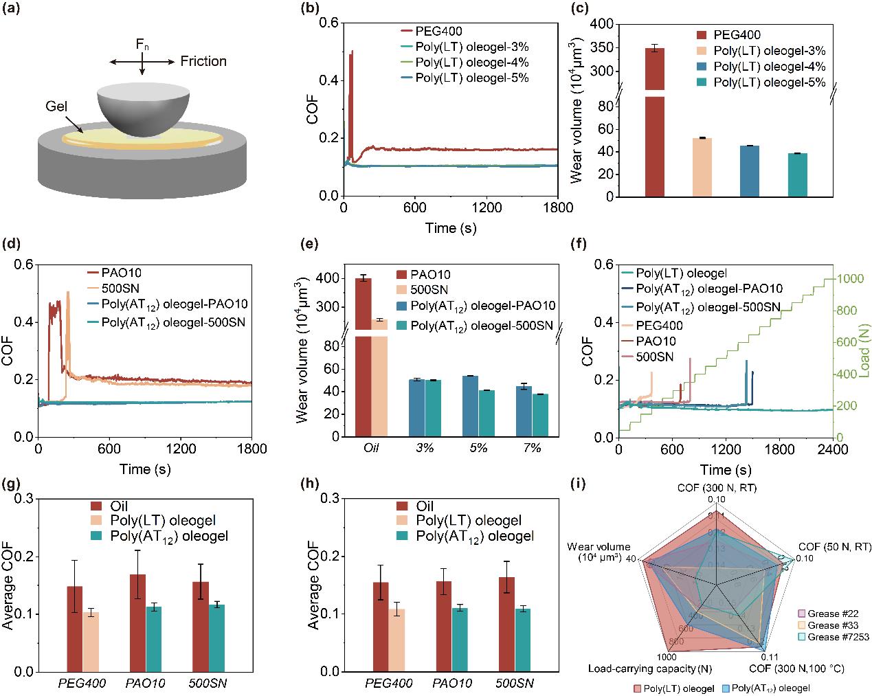 在极端和交变的摩擦条件下,PTA油凝胶表现出优异的摩擦学性能和出色的润滑稳定性,进一步证实其对于恶劣、可变工况的适应性。通过与商用航空润滑脂的系统对比,PTA油凝胶具有在多种测试条件下最为均衡的润滑性能和最优异的长期润滑表现。