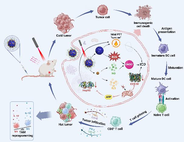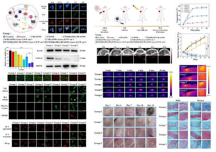 该研究利用双模态探针和荧光-质谱成像联用动态可视化技术,揭示了三重协同抗肿瘤的作用机制。结果表明,利用纳米马达,通过中空硫化铜纳米颗粒HCuSNPs负载气体信号分子供体NOSH,在808 nm激光照射下可控释放H₂S/NO,同时高效转换光能(光热转化效率达27.8%),确保局部温度维持在45℃以下,既能杀伤肿瘤细胞,又避免正常组织损伤。此外,该纳米马达不仅通过H₂S阻断线粒体能量代谢、NO-ROS反应生成ONOO⁻双路径诱导肿瘤凋亡,还可显著重塑肿瘤免疫微环境,促进M1型巨噬细胞极化(比例提升3倍)、CTLs浸润(增加5倍),全面提升免疫抗癌能力。