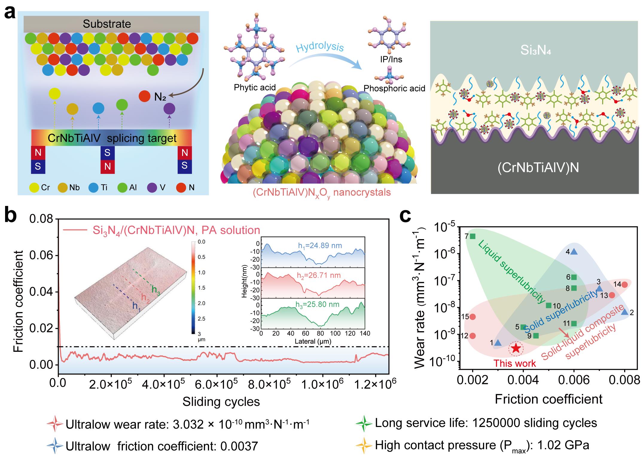 虽然水基超润滑材料具有诸多优势,但其对金属摩擦副的腐蚀问题会影响超润滑状态的长期稳定性。为此,中国科学院兰州化学物理研究所润滑材料全国实验室研究团队近期提出了一种基于摩擦催化效应的“固-液复合超润滑”策略,基于天然有机酸植酸和高熵陶瓷涂层的协同作用实现了优异的减摩抗磨性能,有效地避免了水基润滑剂的腐蚀问题。通过磁控溅射技术在轴承钢表面沉积了(CrNbTiAlV)N高熵陶瓷薄膜(图1),表现出优异的力学性能并提供了丰富的反应位点。此外,在摩擦过程中高熵陶瓷表面还形成了一层钝化层,可有效防止水基润滑剂对钢基体的腐蚀。