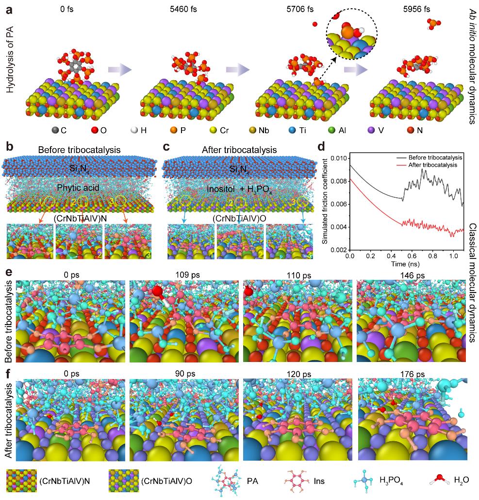 经测试,该固-液复合超润滑体系可在125万次往复摩擦循环中持续保持超润滑状态,摩擦系数低至0.0037,磨损率约为3.032×10−10mm3/(N·m)。摩擦过程中原位形成了平均粒径约为7.3nm的高熵陶瓷纳米晶体,这些纳米晶体促进了植酸分子的水解,生成了肌醇多磷酸(或肌醇)和磷酸分子。通过分子动力学模拟进一步证明,肌醇和磷酸在滑动过程中可有效降低摩擦阻力,从而在宏观尺度上实现固-液复合超润滑(图2)。该研究证实了摩擦催化效应在超润滑中的作用,为设计高性能固-液复合超润滑系统提供了新策略。