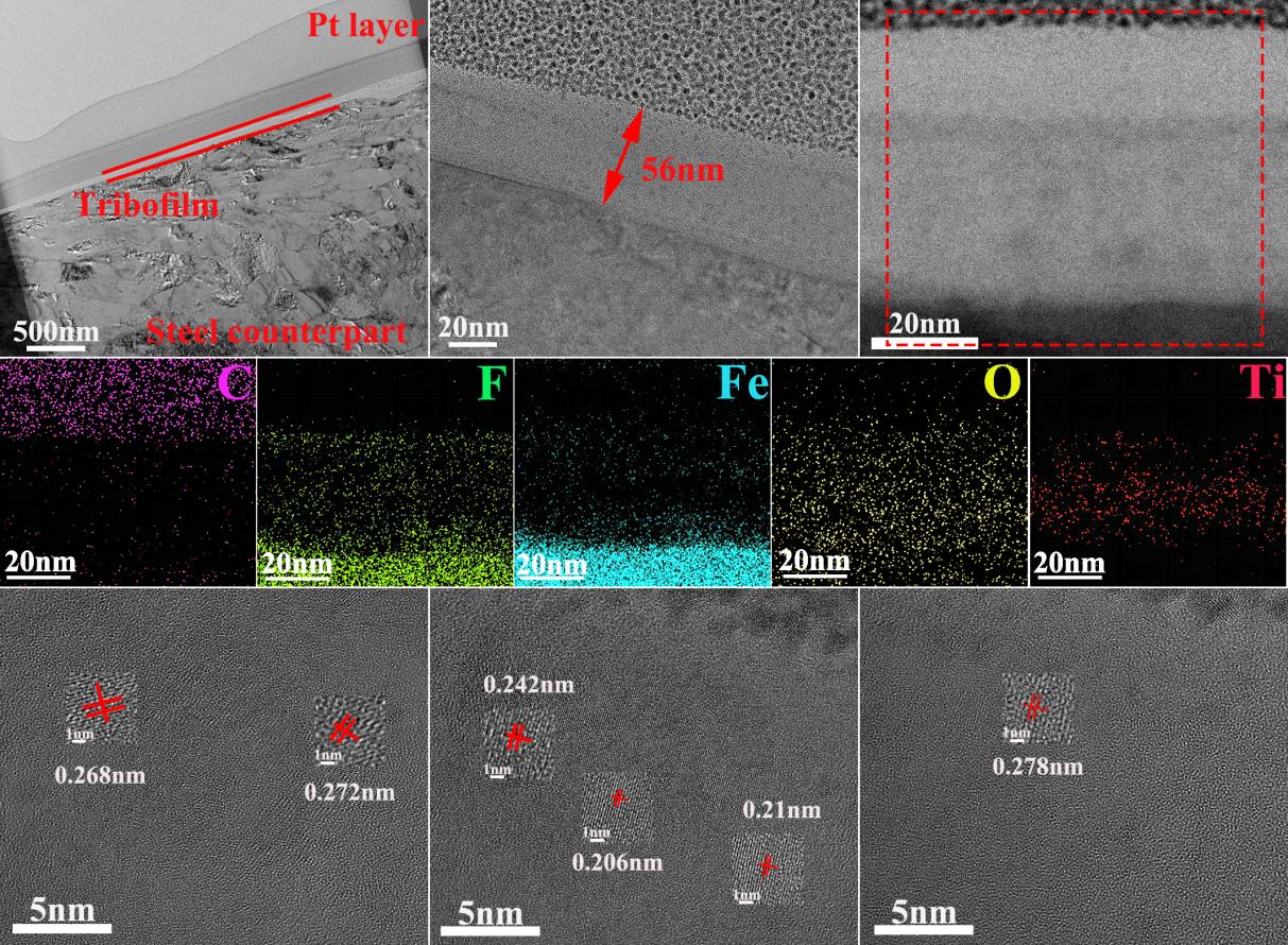 近期,针对纤维织物自润滑复合材料摩擦学性能协同优化的技术难题,研究团队基于前期研究基础,制备了具有核壳结构的Ti3C2/SA/TiO2-MePCM相变微胶囊。该微胶囊以机械强度优异的二氧化钛为壳层增强复合材料力学性能,内核正二十二烷通过相变作用吸收摩擦热并实现局部固-液协同润滑,同时二维材料Ti3C2Tx凭借其层间滑移特性和高承载能力有效降低复合材料的摩擦损伤。实验数据表明,引入该微胶囊后纤维织物自润滑复合材料的摩擦系数由0.053降至0.046,磨损率由8.9×10-14m3 (N·m)-1显著降低至3.5×10-14m3(N·m)-1。研究团队通过多种表征技术系统解析了摩擦膜的微观形貌演变规律,阐明了织物复合材料的减摩抗磨作用机制,为核壳结构材料在摩擦学领域的创新应用提供了理论支撑。