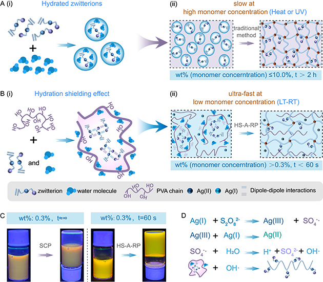 近日,中国科学院兰州化学物理研究所润滑材料全国重点实验室材料表面与界面研究组周峰研究员团队提出了基于一种基于“水合屏蔽”效应的聚两性离子水凝胶制备新方法——HS-A-RP,创新地将PVA作为水合屏蔽剂引入Ag+-S2O82-氧化还原催化体系中,实现了通用性两性离子单体在宽单体浓度范围(质量分数:0.3-50 wt%)、宽温域(-5℃-37℃)内的超快速聚合(t<60 秒),且反应而无需外部能量(紫外光/热)的输入。