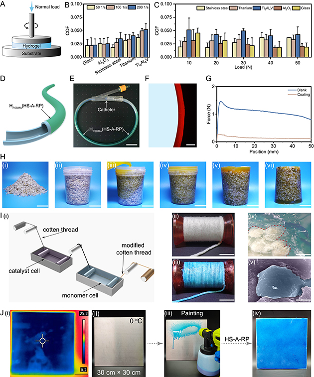 与传统光/热引发体系相比,HS-A-RP 制备的聚两性离子水凝胶不仅具有更致密的网络结构和更好的机械性能,还展现出了优异的抗溶胀、润滑、抗菌和防污性能。通过HS-A-RP方法制备的聚两性离子水凝胶既能够作为功能涂层有效改善生物医用器械的表面润滑性,又能实现对热敏材料和砂砾的原位封装。此外,快速凝胶化和宽温域内可反应的特性使HS-A-RP能够在不同基底表面和极端稳定环境条件下规模化制备聚两性离子水凝胶涂层。该方法不仅为聚两性离子水凝胶的化学合成提供了新途径,还极大地拓展了其在生物医疗、工程装备等领域应用领域。