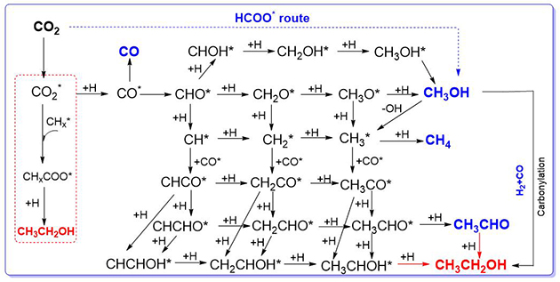 将温室气体CO2与绿氢耦合转化为含两个及以上碳原子的高附加值醇(C2+OH),是实现CO2减排和满足全球能源与化学品需求的重要途径。然而,该过程面临多重挑战,CO2化学性质惰性、反应网络复杂,使得精准控制C-C偶联仍存在很大的挑战性。尽管已开发出贵金属催化剂、改性费托合成催化剂等多种体系,但当前催化体系C2+OH的时空收率仍未达预期,因此,亟需开发更高效的催化剂或设计新的反应路线。