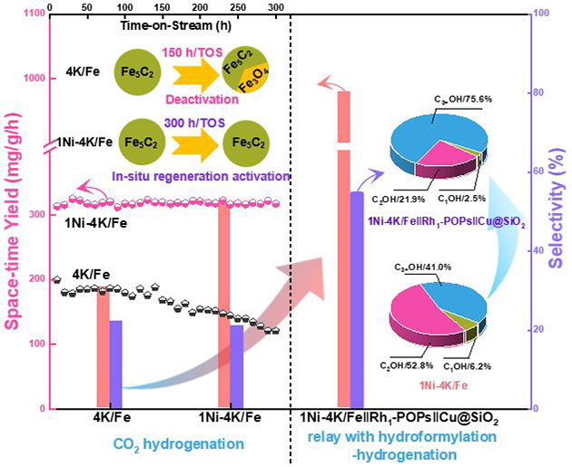 中国科学院兰州化学物理研究所低碳催化与二氧化碳利用全国重点实验室可再生碳资源催化转化组在前期Ni催化CO2加氢合成C2+OH(Angew. Chem. Int. Ed.,2023,DOI: https://doi.org/10.1002/anie.202311335.)和多相催化烯烃氢甲酰化合成醛(J. Catal. 2025,DOI: 10.1016/j.jcat.2025.116095;J. Org. Chem,2023,DOI: 10.1021/acs.joc.2c02105等)的研究基础上,研究人员一方面构建了Ni-K共修饰的Fe基催化剂(1Ni-4K/Fe),将CO2加氢生成C2+OH的时空收率(STY)提高到317.0 mg/g/h,并且能在300h内稳定运行;另一方面利用接力催化思想,构建了“CO2加氢-烯烃氢甲酰化-醛氢化”(1Ni-4K/Fe||Rh1/POPs||Cu@SiO2)的三串联体系,将产物中烯烃进一步转化为醇,实现C2+OH的时空收率达到980.5 mg/g/h,选择性可达55.0%,而且由于氢甲酰化的增碳作用,C2+OH中C3+OH的占比可达75.6%,显著提升碳的利用率。