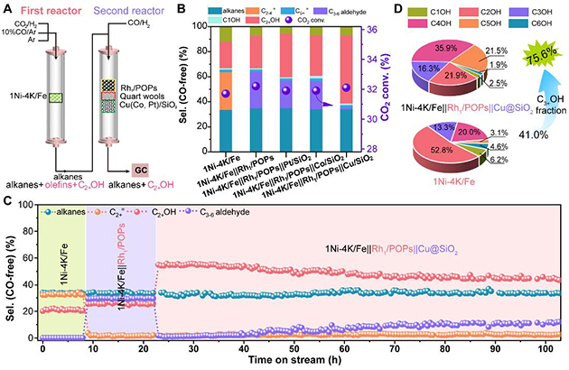 图2. K-Ni共修饰Fe基催化剂及两段三催化剂串联体系的催化CO2加氢合成C2+OH。